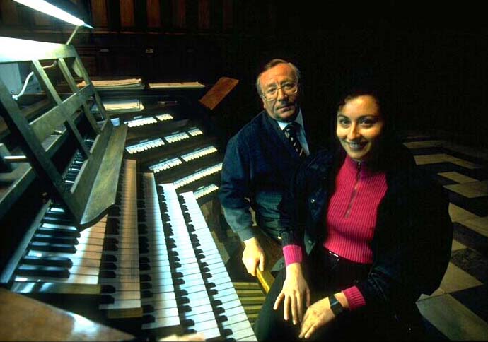 Paulino González con la organista Pilar Cabrera en la consola principal de los cuatro órganos de la Basílica.